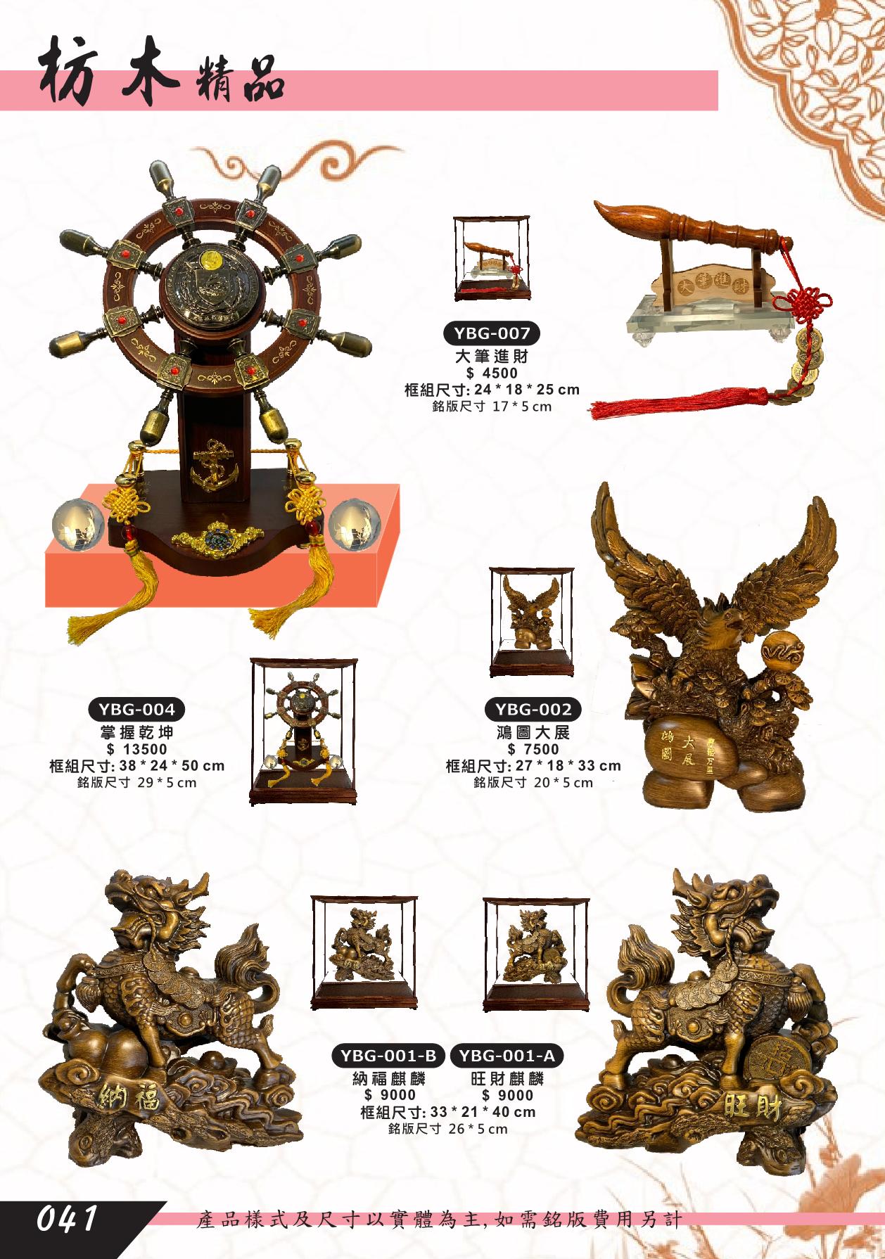 YBG-001,YBG-002,YBG-004,YBG-007,財旺麒麟,納福麒麟,鴻圖大展,鷹,掌握乾坤,大筆進財,枋木藝品