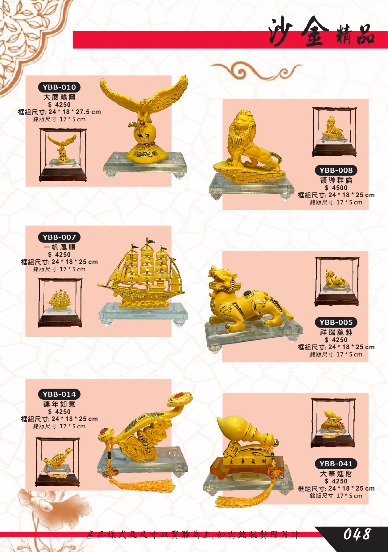 YBB-005,YBB-007,YBB-008,YBB-010,YBB-014,YBB-041,祥瑞貔貅,領導群倫,獅,一帆風順,船,大展鴻圖,鷹,連年如意,大筆進財,沙金藝品
