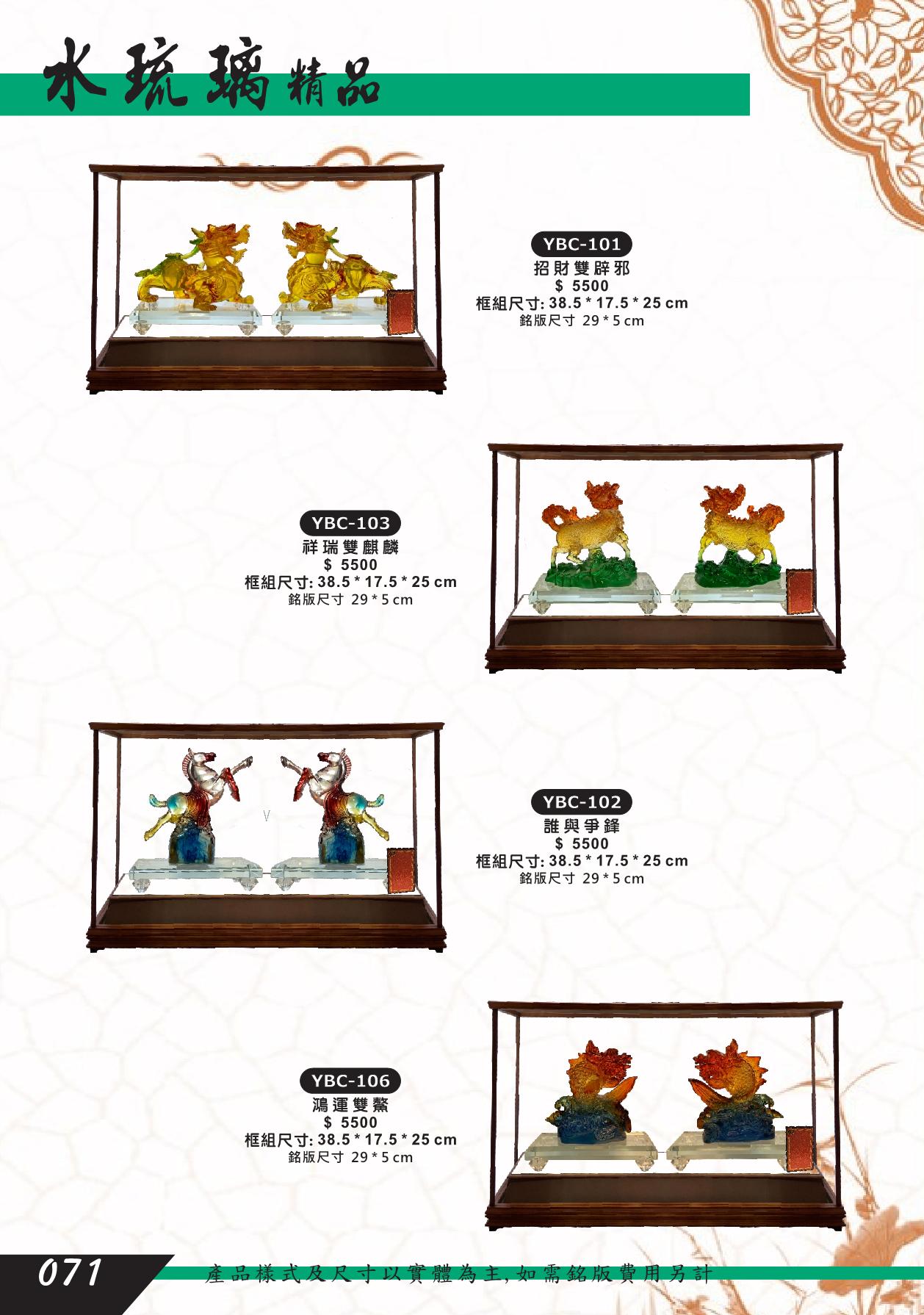YBC-101,YBC-103,YBC-102,YBC-106,招財雙辟邪,祥瑞雙麒麟,誰與爭鋒,鴻運雙鰲,鰲頭,馬,貔貅,水琉璃藝品