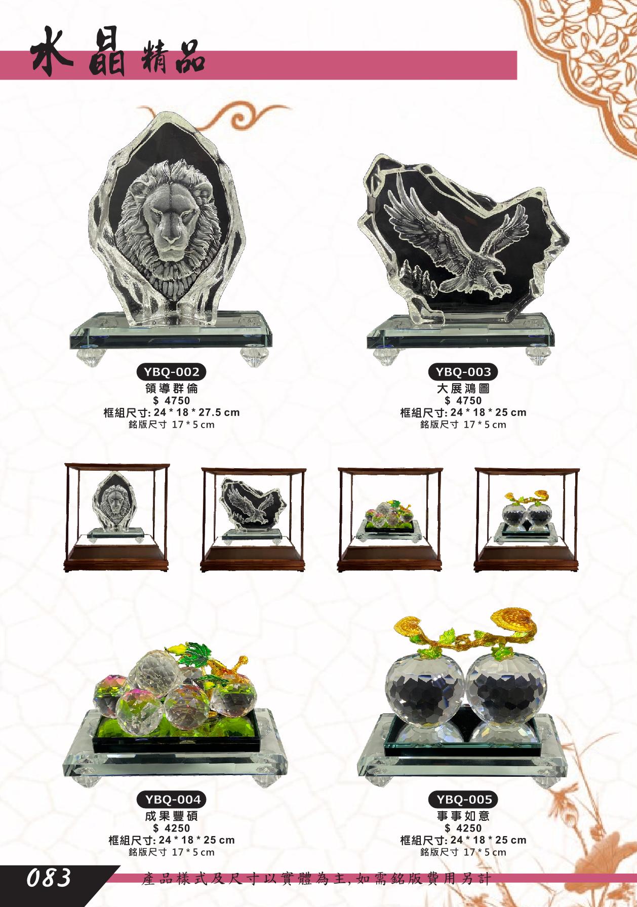 YBQ-002,YBQ-003,YBQ-004,YBQ-005,領導群倫,獅,大展鴻圖,鷹,成果豐碩,事事如意,杮子,水晶藝品