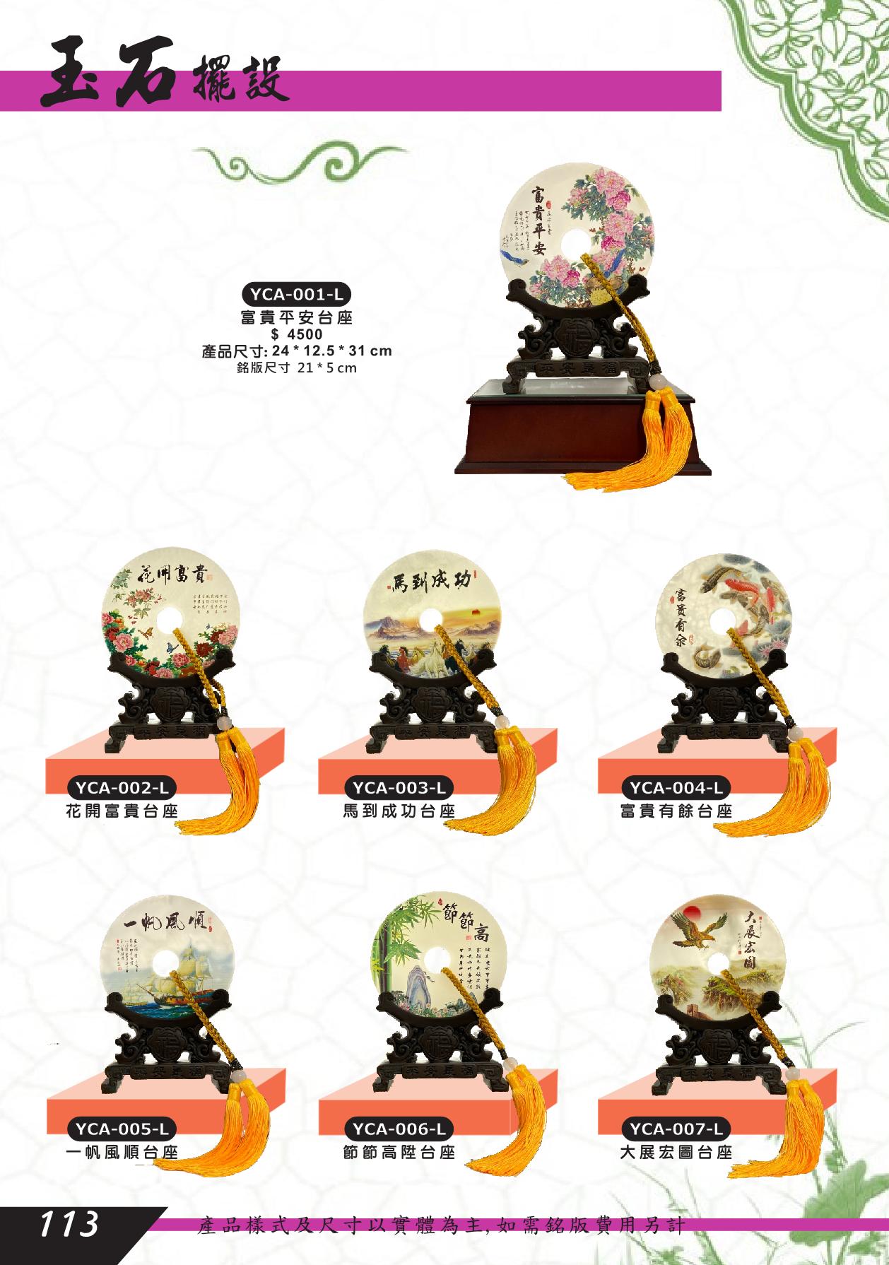 YCA-001,YCA-002,YCA-003,YCA-004,YCA-005,YCA-006,YCA-007,富貴平安,花開富貴,馬到成功,富貴有餘,魚,一帆風順,船,節節高陞,大展宏圖,鷹玉山藝品