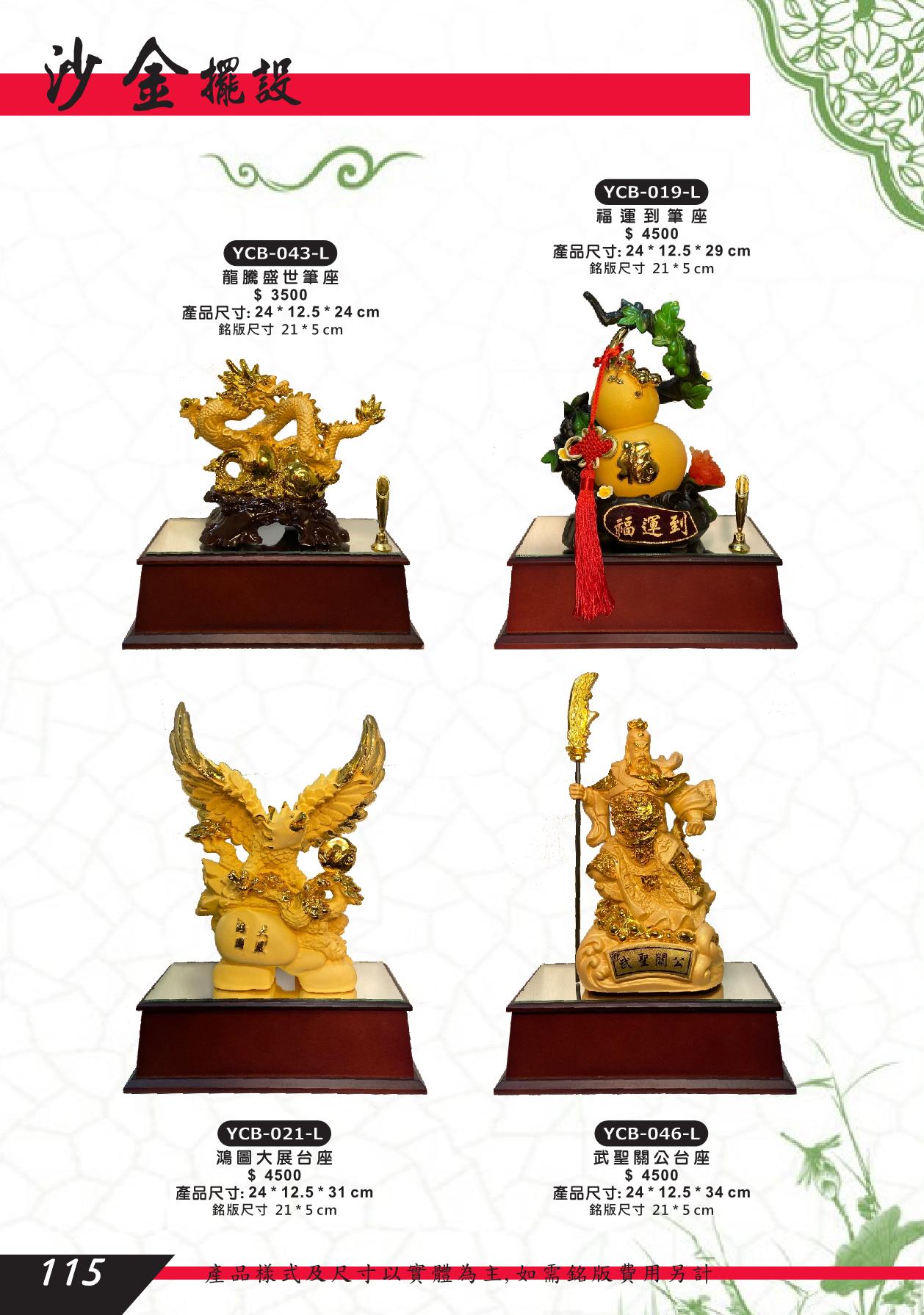 YCB-043-L,YCB-019-L,YCB-021-L,YCB-046-L,龍騰盛世筆座,福運到筆座,鴻圖大展,葫蘆,鷹,武聖關公,沙金藝品