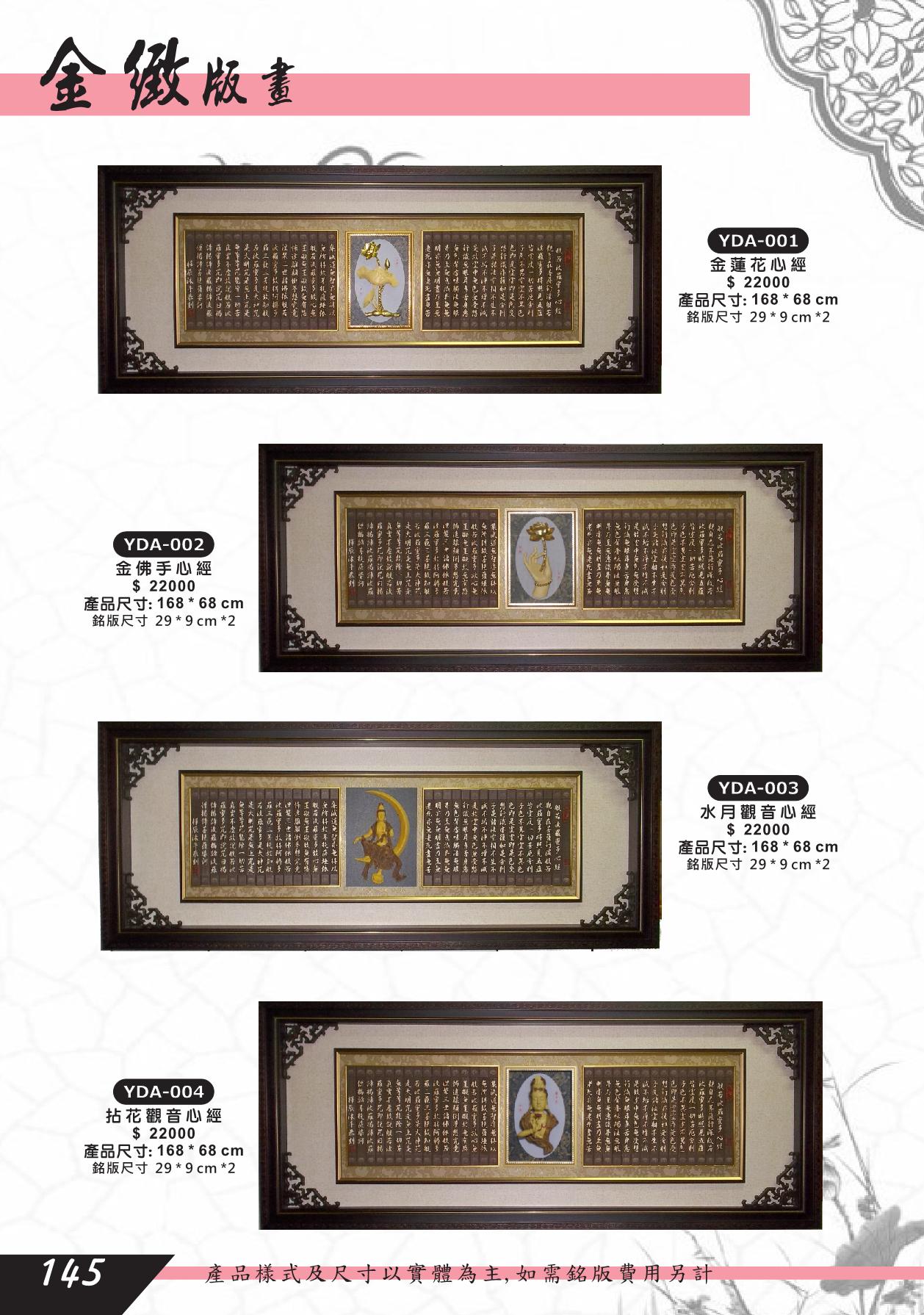 YDA-001,YDA-002,YDA-003,YDA-004,金蓮花,心經,金佛手,水月觀音,拈花觀音,金箔匾額